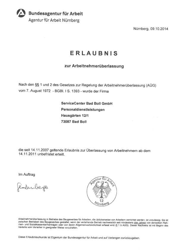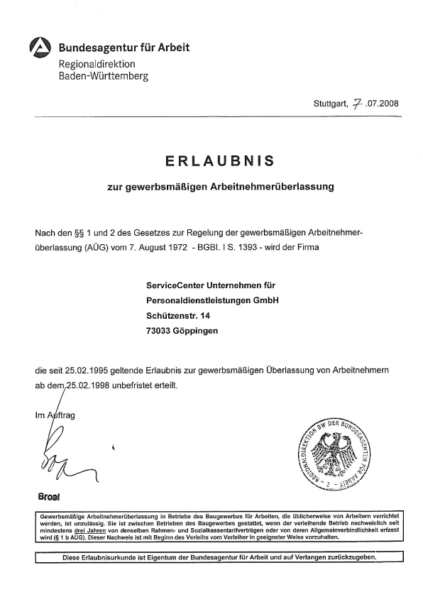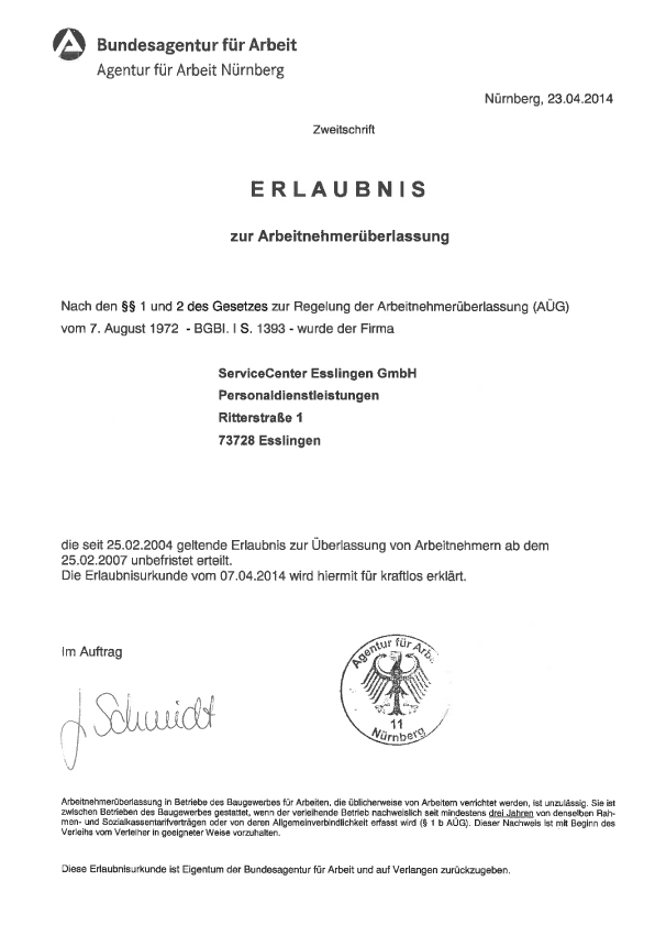Erteilung der unbefristeten Erlaubnis für Arbeitnehmerüberlassung und Arbeitsvermittlung.