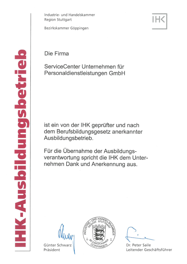 Anerkennung als Ausbildungsbetrieb für Personaldienstkaufleute.